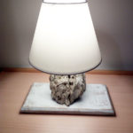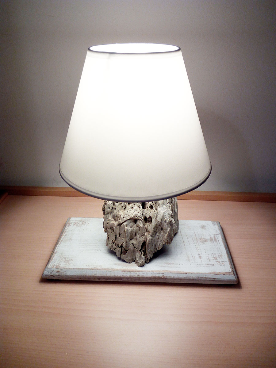 Lampada realizzata con legno che il mare ha reso di colore bianco su tavoletta di faggio in stile shabby chic.